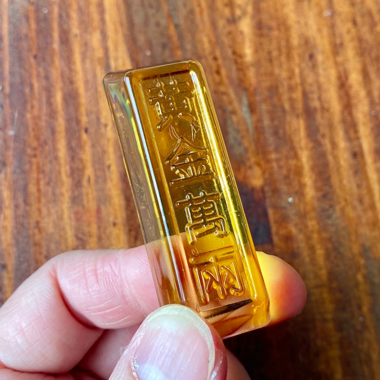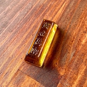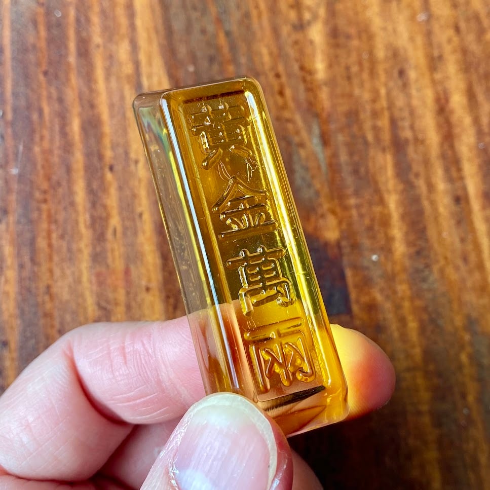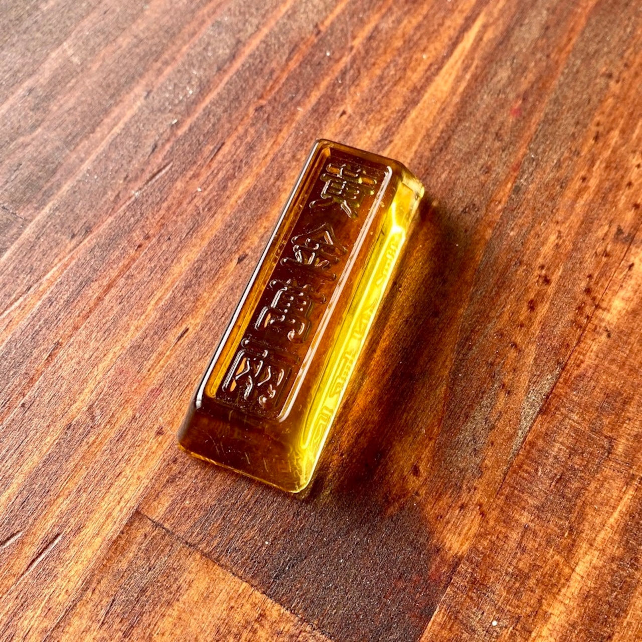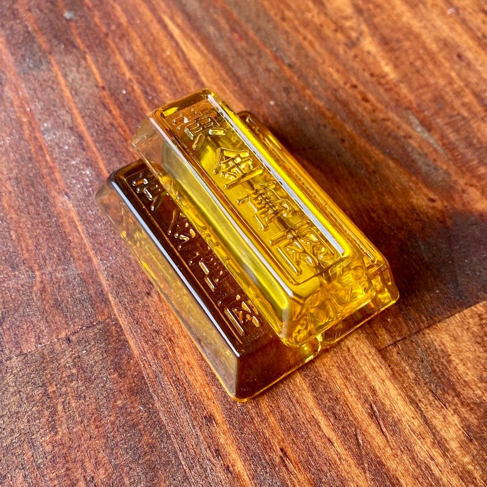これはきっと文鎮だと思うのですが、ルックスがかわいいので飾っておくだけでもほっこりします。中国の人が大好きな、金塊(インゴット)を模った縁起物のガラス製品ですね。